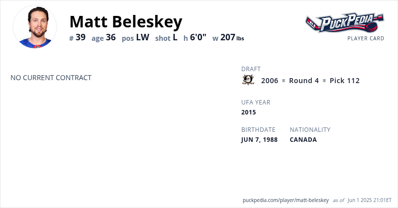 Matt Beleskey is an Unrestricted Free Agent. His last contract was 5 years, $19,000,000 with a cap hit of $3,800,000 per season. It expired at the end of the 2019-20 season.