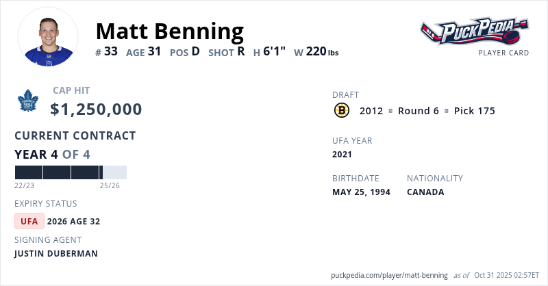 Matt Benning is signed to a 4 year, $5,000,000 contract with a cap hit of $1,250,000 per season, playing for the Toronto Maple Leafs. His contract expires at the end of the 2025-26 season, making Benning an Unrestricted Free Agent.