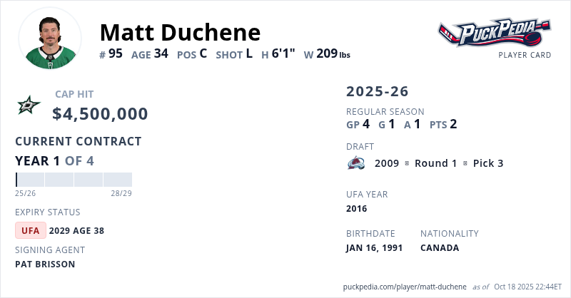 Matt Duchene is signed to a 4 year, $18,000,000 contract with a cap hit of $4,500,000 per season, playing for the Dallas Stars. His contract expires at the end of the 2028-29 season, making Duchene an Unrestricted Free Agent.