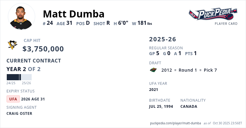 Matt Dumba is signed to a 2 year, $7,500,000 contract with a cap hit of $3,750,000 per season, playing for the Pittsburgh Penguins. His contract expires at the end of the 2025-26 season, making Dumba an Unrestricted Free Agent.