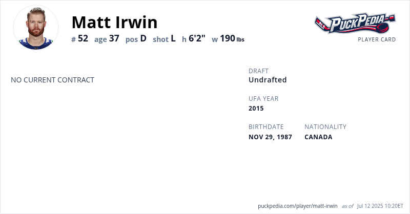 Matt Irwin is an Unrestricted Free Agent. His last contract was 1 year, $775,000 with a cap hit of $775,000 per season. It expired at the end of the 2023-24 season.