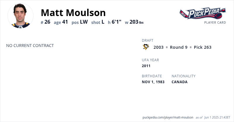 Matt Moulson is an Unrestricted Free Agent. His last contract was 5 years, $25,000,000 with a cap hit of $5,000,000 per season. It expired at the end of the 2018-19 season.