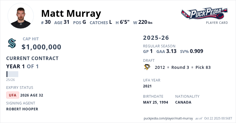 Matt Murray is signed to a 1 year, $1,000,000 contract with a cap hit of $1,000,000 per season, playing for the Seattle Kraken. His contract expires at the end of the 2025-26 season, making Murray an Unrestricted Free Agent.