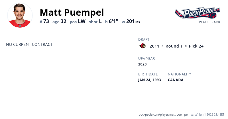 Matt Puempel is an Unrestricted Free Agent. His last contract was 2 years, $1,350,000 with a cap hit of $675,000 per season. It expired at the end of the 2019-20 season.