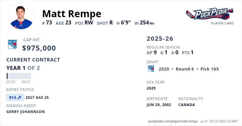 Matt Rempe is signed to a 2 year, $1,950,000 contract with a cap hit of $975,000 per season, playing for the New York Rangers. His contract expires at the end of the 2026-27 season, making Rempe a Restricted Free Agent.