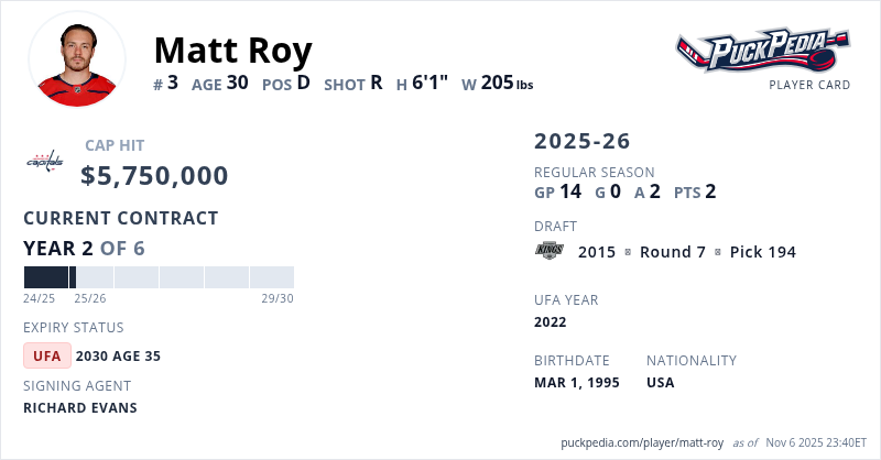 Matt Roy is signed to a 6 year, $34,500,000 contract with a cap hit of $5,750,000 per season, playing for the Washington Capitals. His contract expires at the end of the 2029-30 season, making Roy an Unrestricted Free Agent.