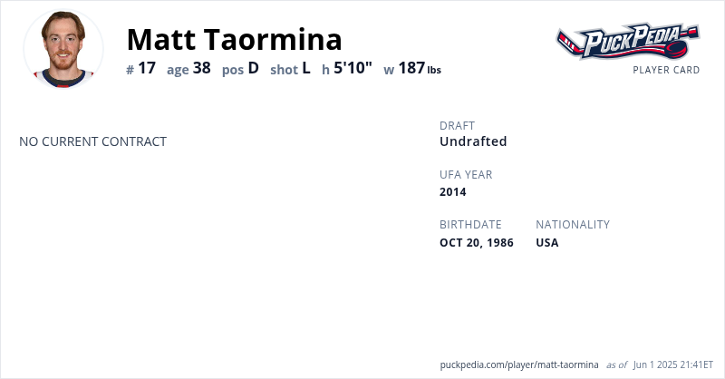 Matt Taormina is an Unrestricted Free Agent. His last contract was 2 years, $1,300,000 with a cap hit of $650,000 per season. It expired at the end of the 2018-19 season.