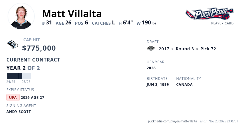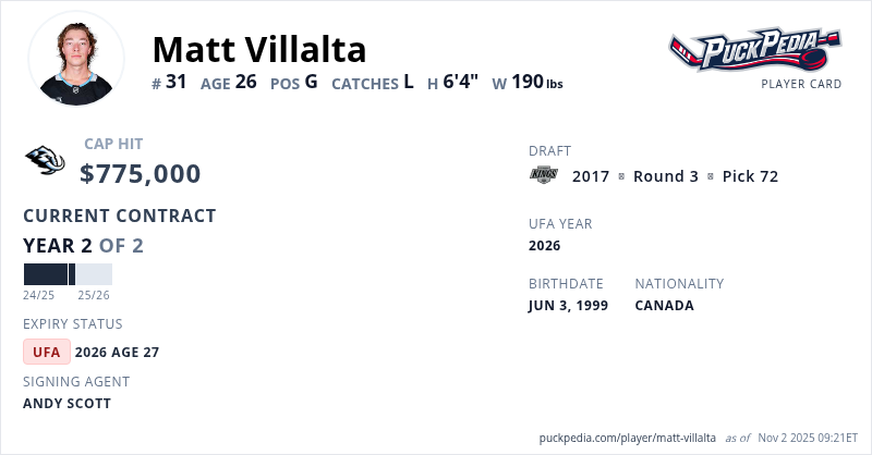 Matt Villalta is signed to a 2 year, $1,550,000 contract with a cap hit of $775,000 per season, playing for the Utah Mammoth. His contract expires at the end of the 2025-26 season, making Villalta an Unrestricted Free Agent.