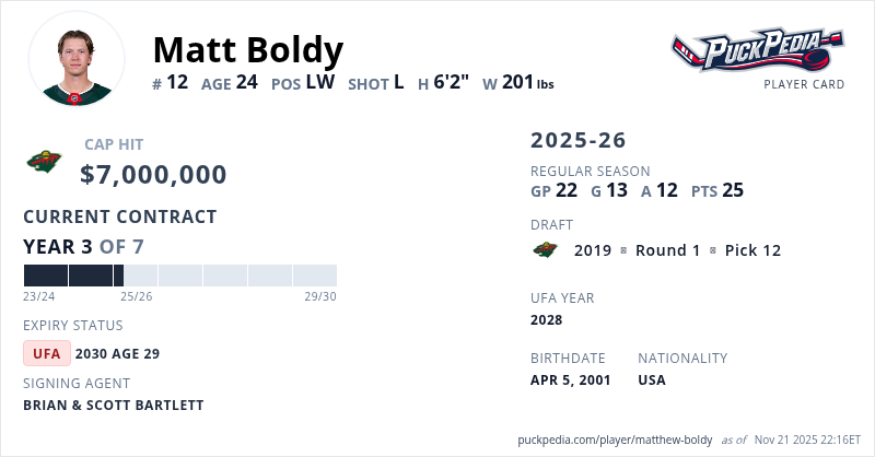 Matt Boldy is signed to a 7 year, $49,000,000 contract with a cap hit of $7,000,000 per season, playing for the Minnesota Wild. His contract expires at the end of the 2029-30 season, making Boldy an Unrestricted Free Agent.