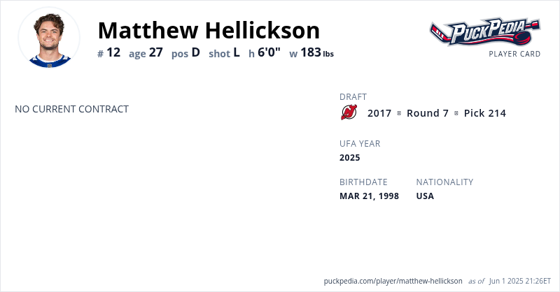 | 2020-21 | 22 | AHL | Binghamton Devils | 5 | 0 | 0 | 0 | 19 | ||||||||||||||||||||||