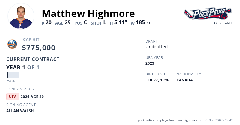 Matthew Highmore is signed to a 1 year, $775,000 contract with a cap hit of $775,000 per season, playing for the New York Islanders. His contract expires at the end of the 2025-26 season, making Highmore an Unrestricted Free Agent.