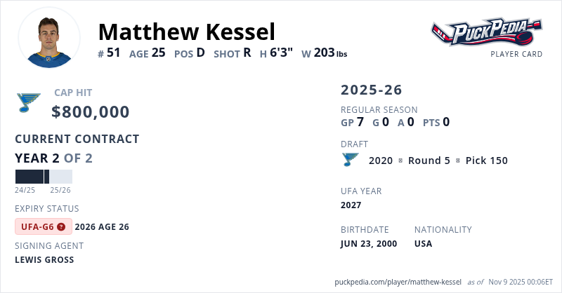 Matthew Kessel is signed to a 2 year, $1,600,000 contract with a cap hit of $800,000 per season, playing for the St. Louis Blues. His contract expires at the end of the 2025-26 season, making Kessel an Unrestricted Free Agent (Group 6).