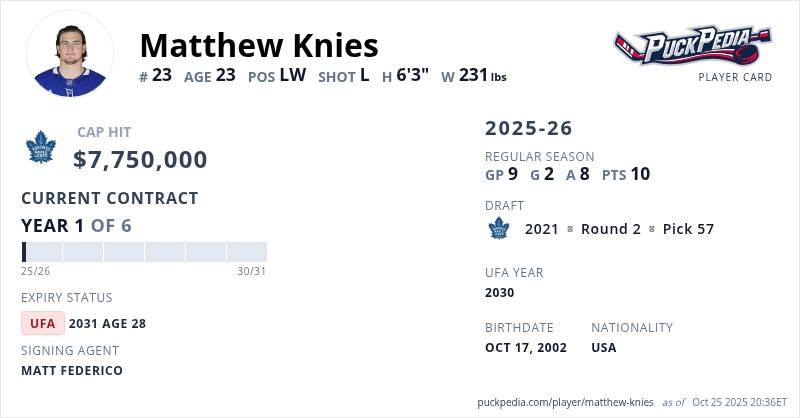 Matthew Knies is signed to a 6 year, $46,500,000 contract with a cap hit of $7,750,000 per season, playing for the Toronto Maple Leafs. His contract expires at the end of the 2030-31 season, making Knies an Unrestricted Free Agent.