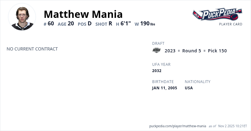 | 2021-22 | 16 | OHL | Sudbury Wolves | 49 | 2 | 11 | 13 | 24 | ||||||||||||||||||||||
