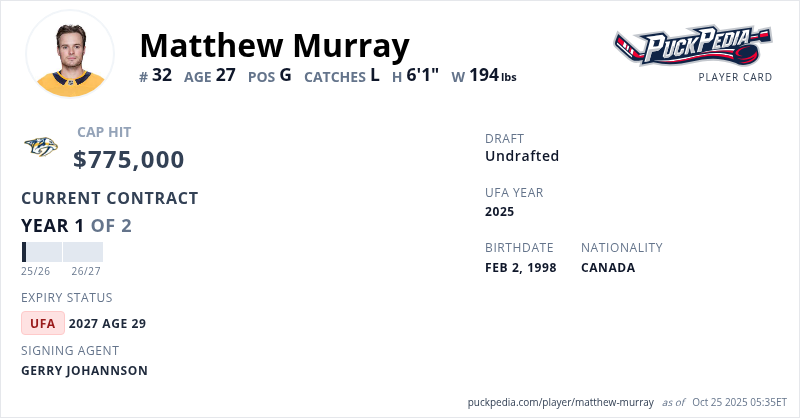 Matthew Murray is signed to a 2 year, $1,550,000 contract with a cap hit of $775,000 per season, playing for the Nashville Predators. His contract expires at the end of the 2026-27 season, making Murray an Unrestricted Free Agent.