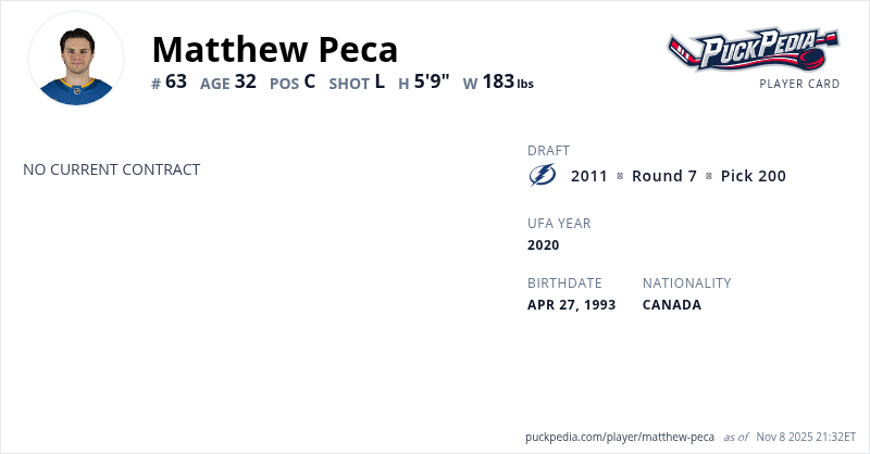 Matthew Peca is an Unrestricted Free Agent. His last contract was 2 years, $1,525,000 with a cap hit of $762,500 per season. It expired at the end of the 2023-24 season.