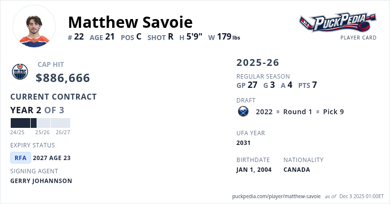 Matthew Savoie is signed to a 3 year, $2,659,998 contract with a cap hit of $886,666 per season, playing for the Edmonton Oilers. His contract expires at the end of the 2026-27 season, making Savoie a Restricted Free Agent.