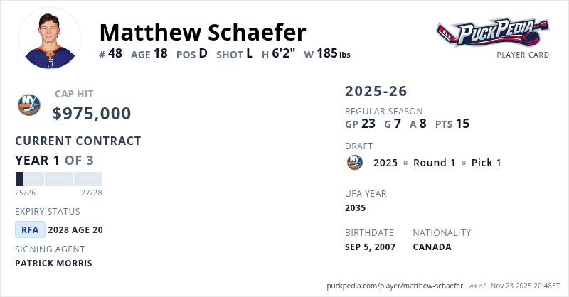 Matthew Schaefer is signed to a 3 year, $2,925,000 contract with a cap hit of $975,000 per season, playing for the New York Islanders. His contract expires at the end of the 2027-28 season, making Schaefer a Restricted Free Agent.