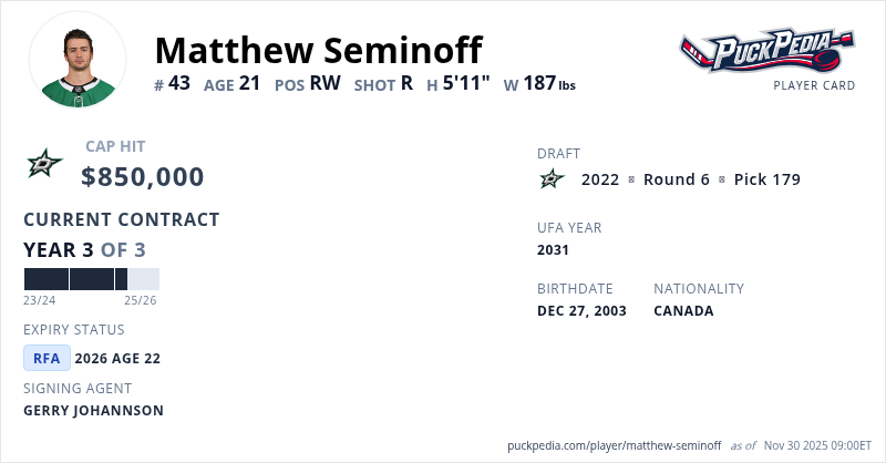 Matthew Seminoff is signed to a 3 year, $2,550,000 contract with a cap hit of $850,000 per season, playing for the Dallas Stars. His contract expires at the end of the 2025-26 season, making Seminoff a Restricted Free Agent.