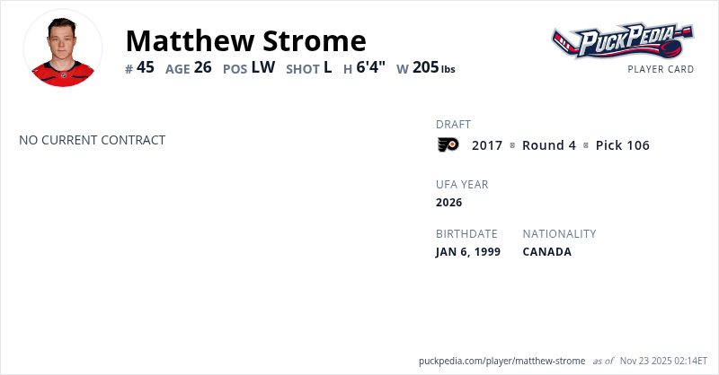 Matthew Strome is an Unrestricted Free Agent (No Qualifying Offer). His last contract was 3 years, $2,329,998 with a cap hit of $776,666 per season. It expired at the end of the 2021-22 season.