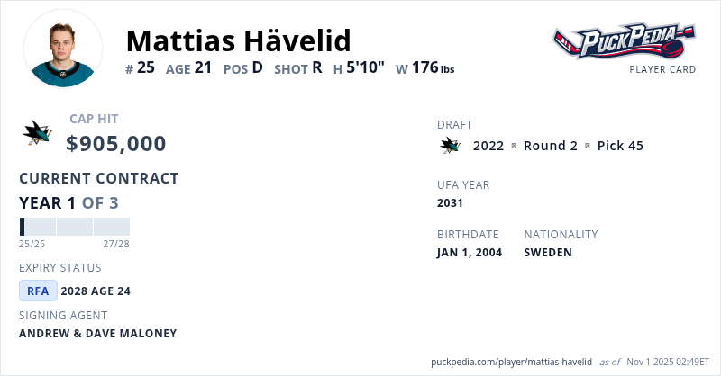 Mattias Hävelid is signed to a 3 year, $2,715,000 contract with a cap hit of $905,000 per season, playing for the San Jose Sharks. His contract expires at the end of the 2027-28 season, making Hävelid a Restricted Free Agent.