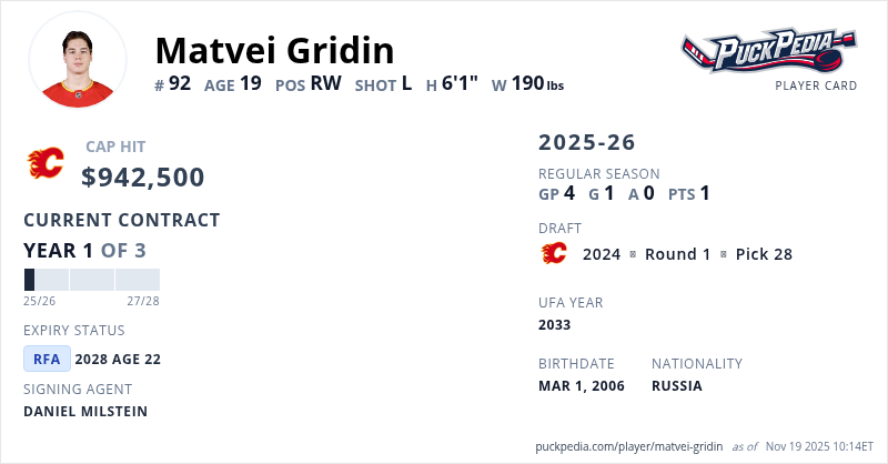 Matvei Gridin is signed to a 3 year, $2,827,500 contract with a cap hit of $942,500 per season, playing for the Calgary Flames. His contract expires at the end of the 2027-28 season, making Gridin a Restricted Free Agent.
