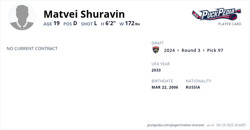 | 2023-24 | 17 | MHL | Krasnaya Armiya Moskva | 22 | 0 | 7 | 7 | 26 | ||||||||||||||||||||||