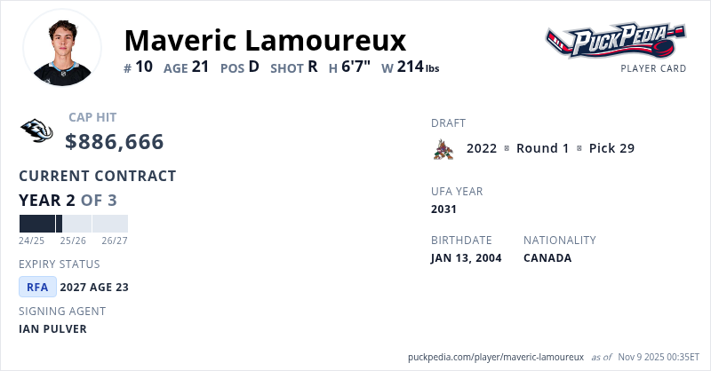 Maveric Lamoureux is signed to a 3 year, $2,659,998 contract with a cap hit of $886,666 per season, playing for the Utah Mammoth. His contract expires at the end of the 2026-27 season, making Lamoureux a Restricted Free Agent.