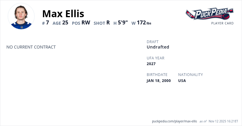 Max Ellis is an Unrestricted Free Agent (No Qualifying Offer). His last contract was 2 years, $1,677,500 with a cap hit of $838,750 per season. It expired at the end of the 2023-24 season.