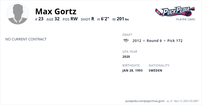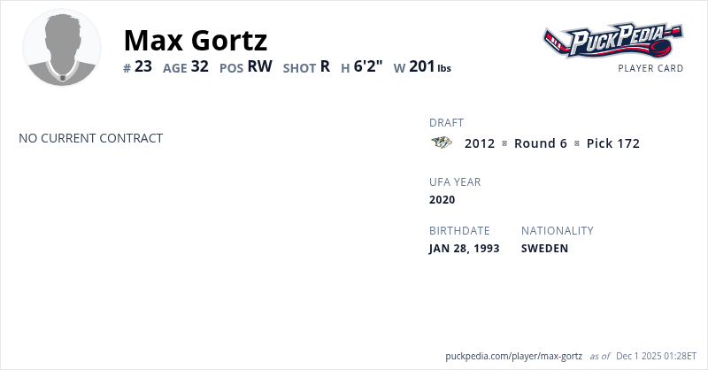 Max Gortz is a Restricted Free Agent. His last contract was 3 years, $1,850,001 with a cap hit of $616,667 per season. It expired at the end of the 2016-17 season.