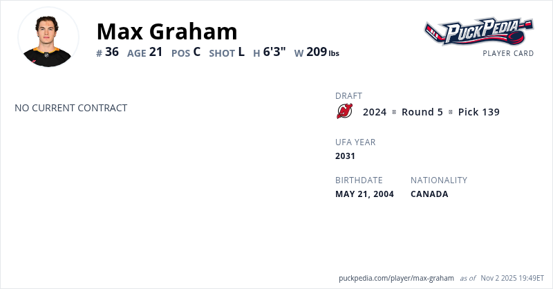 Graham, Chase Stillman and a 2027 third-round pick were traded to the Pittsburgh Penguins from the New Jersey Devils in exchange for Cody Glass and Johnny Gruden on Friday.