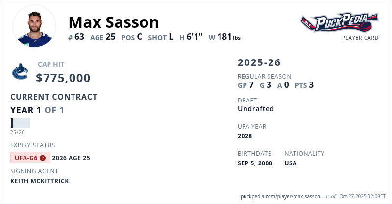 Max Sasson is signed to a 1 year, $775,000 contract with a cap hit of $775,000 per season, playing for the Vancouver Canucks. His contract expires at the end of the 2025-26 season, making Sasson an Unrestricted Free Agent (Group 6).