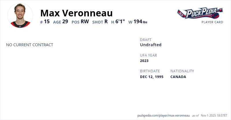 Max Veronneau is an Unrestricted Free Agent. His last contract was 1 year, $750,000 with a cap hit of $750,000 per season. It expired at the end of the 2022-23 season.