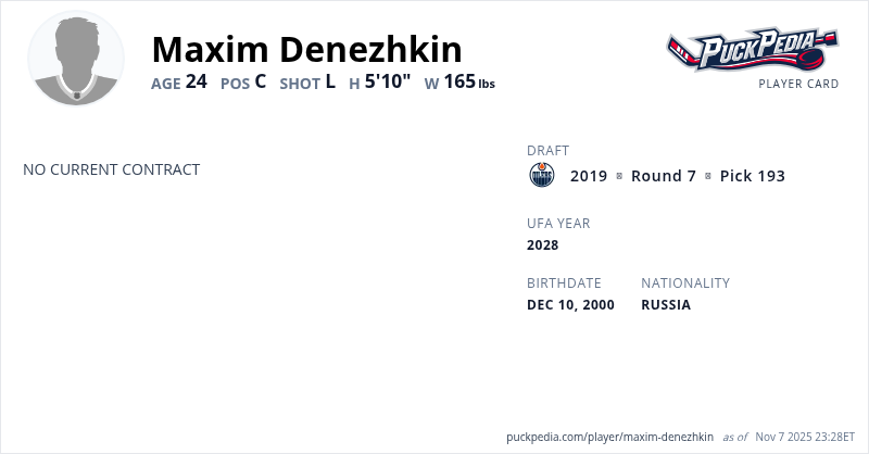 | 2025-26 | 25 | KHL | Avtomobilist Yekaterinburg | 22 | 6 | 8 | 14 | 6 | ||||||||||||||||||||||