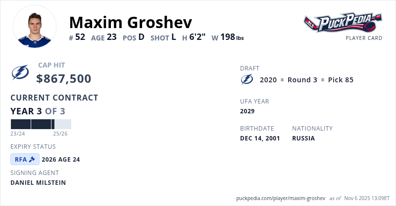 Maxim Groshev is signed to a 3 year, $2,602,500 contract with a cap hit of $867,500 per season, playing for the Tampa Bay Lightning. His contract expires at the end of the 2025-26 season, making Groshev a Restricted Free Agent.