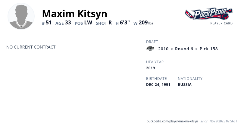 | 2022-23 | 31 | VHL | Metallurg Novokuznetsk | 49 | 19 | 19 | 38 | 31 | Playoffs | 18 | 7 | 9 | 16 | 0 | ||||||||||||||||