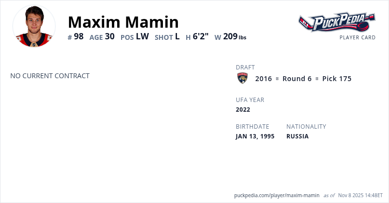 Maxim Mamin is an Unrestricted Free Agent. His last contract was 1 year, $975,000 with a cap hit of $975,000 per season. It expired at the end of the 2021-22 season.