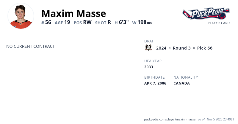 Masse was the 66th overall pick by the Anaheim Ducks in the 2024 NHL Entry Draft on Saturday.