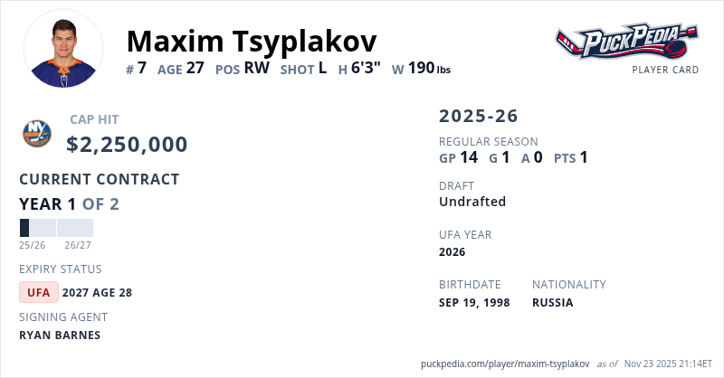 Maxim Tsyplakov is signed to a 2 year, $4,500,000 contract with a cap hit of $2,250,000 per season, playing for the New York Islanders. His contract expires at the end of the 2026-27 season, making Tsyplakov an Unrestricted Free Agent.