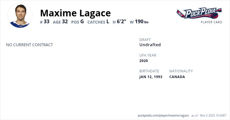 Maxime Lagace is an Unrestricted Free Agent. His last contract was 1 year, $750,000 with a cap hit of $750,000 per season. It expired at the end of the 2022-23 season.