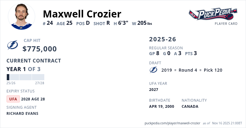 Maxwell Crozier is signed to a 3 year, $2,325,000 contract with a cap hit of $775,000 per season, playing for the Tampa Bay Lightning. His contract expires at the end of the 2027-28 season, making Crozier an Unrestricted Free Agent.
