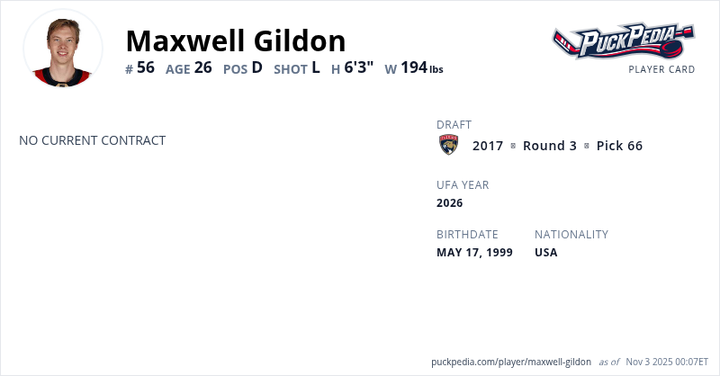Maxwell Gildon is an Unrestricted Free Agent (No Qualifying Offer). His last contract was 3 years, $2,559,999 with a cap hit of $853,333 per season. It expired at the end of the 2022-23 season.