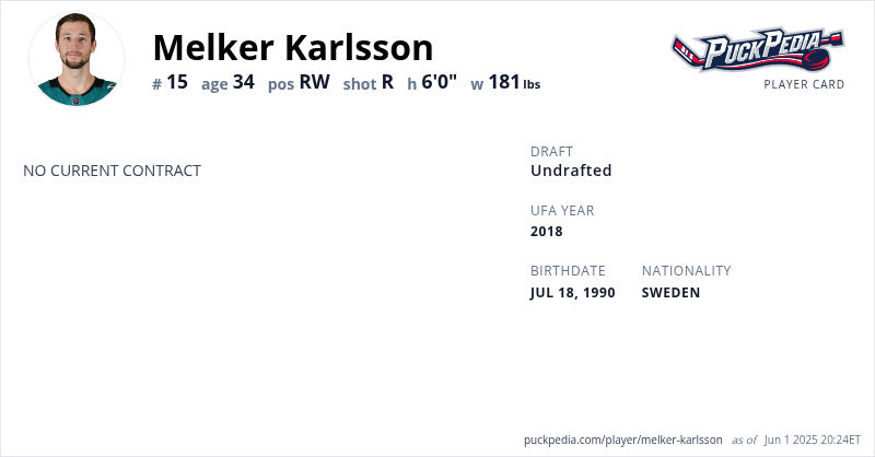 Melker Karlsson is an Unrestricted Free Agent. His last contract was 3 years, $6,000,000 with a cap hit of $2,000,000 per season. It expired at the end of the 2019-20 season.