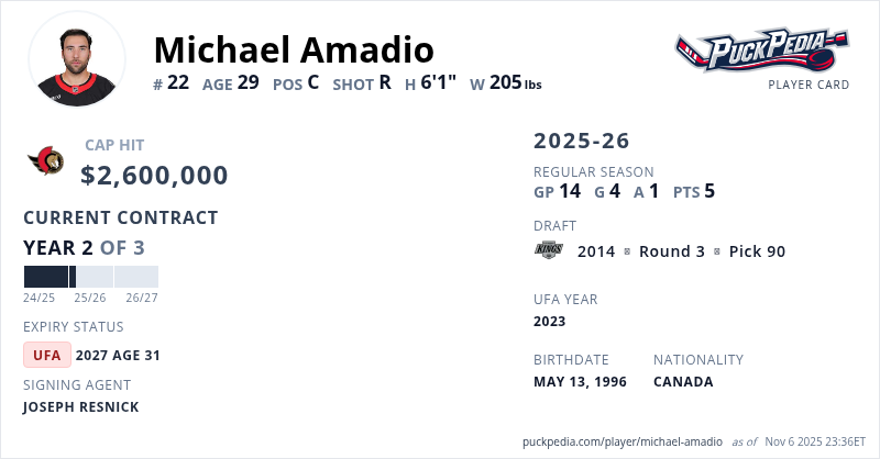 Michael Amadio is signed to a 3 year, $7,800,000 contract with a cap hit of $2,600,000 per season, playing for the Ottawa Senators. His contract expires at the end of the 2026-27 season, making Amadio an Unrestricted Free Agent.