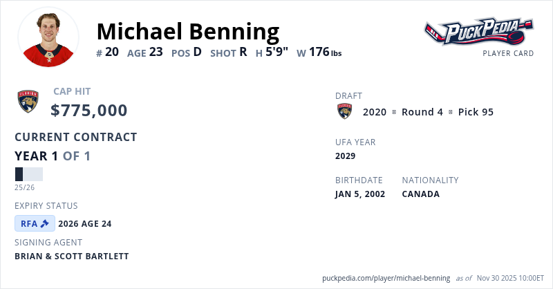 Michael Benning is signed to a 1 year, $775,000 contract with a cap hit of $775,000 per season, playing for the Florida Panthers. His contract expires at the end of the 2025-26 season, making Benning a Restricted Free Agent.