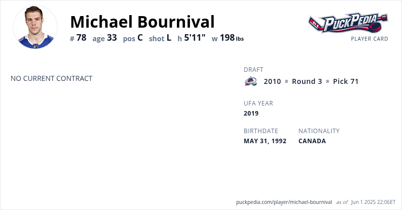 Michael Bournival is an Unrestricted Free Agent. His last contract was 1 year, $650,000 with a cap hit of $650,000 per season. It expired at the end of the 2018-19 season.