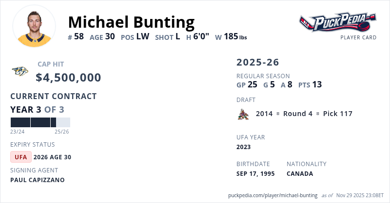 Michael Bunting is signed to a 3 year, $13,500,000 contract with a cap hit of $4,500,000 per season, playing for the Nashville Predators. His contract expires at the end of the 2025-26 season, making Bunting an Unrestricted Free Agent.