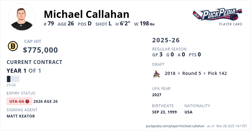 Michael Callahan is signed to a 1 year, $775,000 contract with a cap hit of $775,000 per season, playing for the Boston Bruins. His contract expires at the end of the 2025-26 season, making Callahan an Unrestricted Free Agent (Group 6).