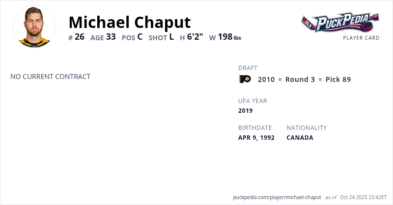 Michael Chaput is an Unrestricted Free Agent. His last contract was 1 year, $750,000 with a cap hit of $750,000 per season. It expired at the end of the 2021-22 season.