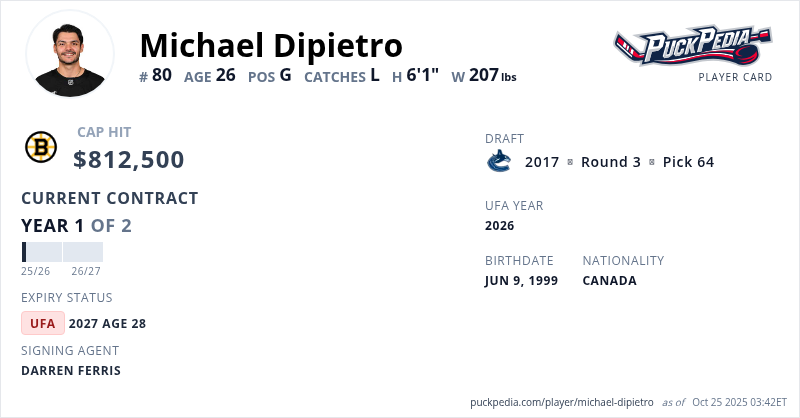 Michael Dipietro is signed to a 2 year, $1,625,000 contract with a cap hit of $812,500 per season, playing for the Boston Bruins. His contract expires at the end of the 2026-27 season, making Dipietro an Unrestricted Free Agent.